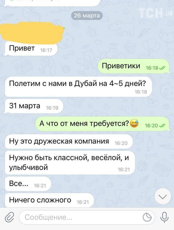 Как видно из скриншота, который опубликовал ТСН, приглашение полететь с компанией в Дубай не предвещало ничего плохого. Вероятно, сообщение одной из участниц фотосессии прислал организатор скандальной фотосессии Виталий Гречин.