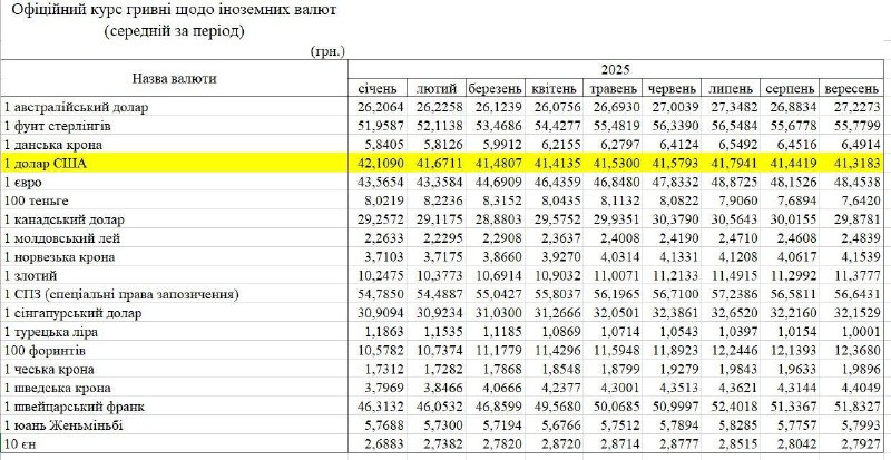 - октябрь 2025 года - 42,0-42,1 грн/$;