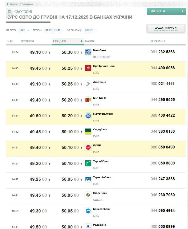 Средний наличный курс покупки/продажи евро с минувшей среды, 10 декабря вырос с 48,96-49,56 грн/€ до 49,35-49,99 грн/€, а средний карточный — с 48,87-49,54 грн/€ до 49,29-49,98 грн/€. При этом максимальный карточный курс продажи достигает 50,46 грн/€ — его сейчас ставит "Райффайзен Банк".