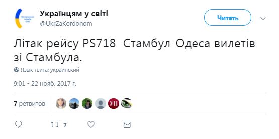 При этом самолет рейса "Стамбул-Одесса" уже вылетел в Одессу. Об этом Департамент консульской службы Министерства иностранных дел Украины сообщает в Twitter.