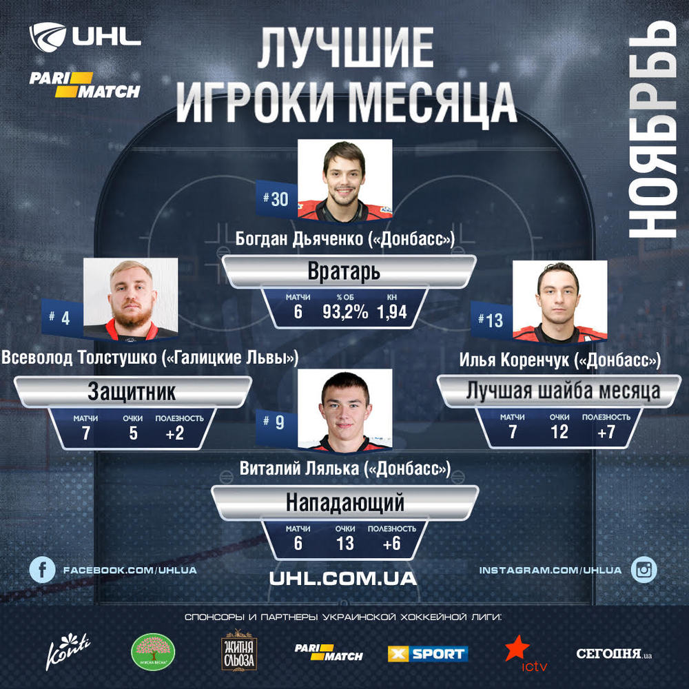 Лучшим нападающим ноября экспертами был назван нападающий "Донбасса" Виталий Лялька. 21-летний игрок национальной сборной Украины очень мощно провёл ноябрьские матчи – забросил в 6 матчах 9 шайб, и отдал 4 результативных передачи. Две шайбы Виталия стали победными для "Донбасса", а его хет-трик в матче против "Галицких Львов" определил победителя в поединке (5:3).