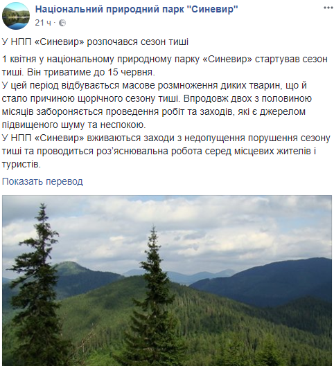 С 1 апреля сезон тишины начался на территории Национального природного парка "Синевир" в Закарпатской области. Об этом сообщается на странице парка в Facebook. Шуметь нельзя будет до 15 июня.