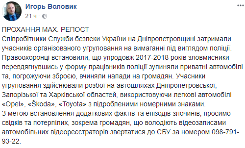 "Правоохранители установили, что на протяжении 2017-2018 годов злоумышленники, переодеваясь в форму сотрудников полиции, останавливали частные автомобили и, угрожая оружием, совершали нападения на граждан. Участники группировки осуществляли разбои на дорогах Днепропетровской, Запорожской и Харьковской областей, используя легковые автомобили Ореl, Škoda, Toyota с поддельными номерными знаками", - говорится в сообщении в соцсети.
