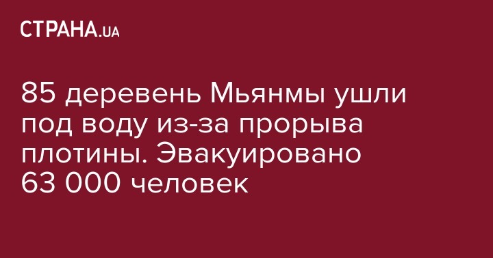 В Мьянме 85 деревень оказались под водой в результате прорыва плотины. Более 63 тысяч человек были вынуждены покинуть свои дома. Об этом сообщает Reuters.