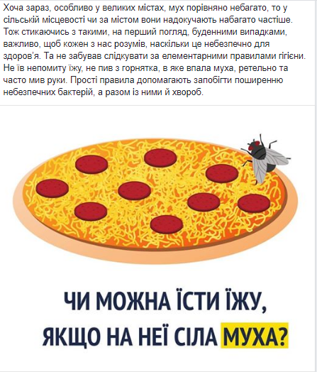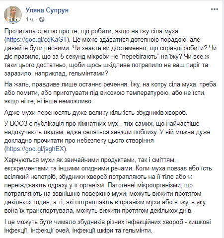 В случае, если на вашу еду села муха, есть ее можно, только помыв или приготовив ее при высокой температуре. Об этом написала на своей странице в Facebook и.о. Министра охраны здоровья Украины Ульяна Супрун.