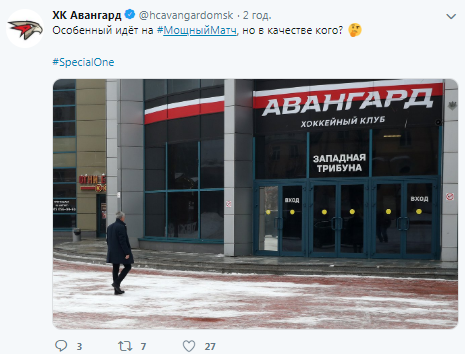Официальный Twitter омского Авангарда уже опубликовал фото Жозе Моуринью перед входом во Дворец спорта.