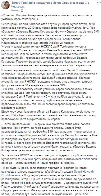 Сегодня в КУиеве прошла пресс-конференция НСЖУ, на которой были озвучены обстоятельства убийства Вадима Комарова. Также речь шла о физической безопасности работников СМИ в Украине, борьбе с системной безнаказанностью за преступления против журналистов.