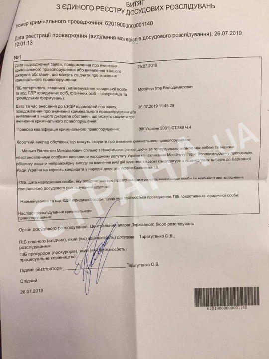 В извлечении из Единого реестра досудебных расследований говорится, что Манько в сговоре с Ириной Наконечной и "другими неустановленными лицами" предлагали нардепу Мосийчуку снять свою кандидатуру на внеочередных выборах в Верховную Раду в пользу нардепа от БПП Игоря Кононенко.