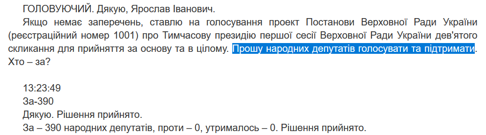 В этот день руководство парламента основном просило депутатов "поддержать" вопросы повестки дня, то есть голосовать "за". А когда речь шла об избрании кандидатуры на должность вице-спикера, относительно всех кандидатов Дмитрий Разумков призывал депутатов "определяться". И только когда ставил на голосование кандидатуру Елены Кондратюк (которая в итоге стала вице-спикером) - "поддержать".