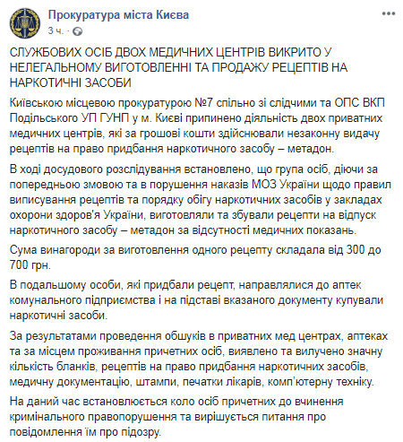 В Киеве разоблачили незаконную деятельность двух частных медицинских центров, которые торговали рецептами на наркотическое средство - метадон. Об этом в Facebook сообщила пресс-служба Прокуратуры Киева.
