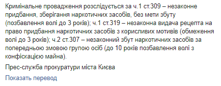 Уголовное производство расследуется по ч.1 ст.309 - незаконное приобретение, хранение наркотических средств без цели сбыта (лишение свободы до 3 лет); ч.1 ст.319 - незаконная выдача рецепта на право приобретения наркотических средств из корыстных побуждений (ограничение свободы до 3 лет); ч.2 ст.307 - незаконный сбыт наркотических средств по предварительному сговору группой лиц (до 10 лет лишения свободы с конфискацией имущества).