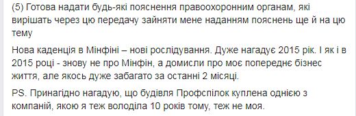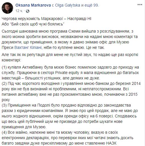"Покупка "Актив-банка" была моей бизнес-ошибкой задолго до прихода на службу. Работая в секторе Private equity я имела отношение ко многим инвестициям - большинству успешных, но некоторых не слишком. Во время короткого владения и управления мной банком в марте 2014 он не был признан ни проблемным, ни неплатежеспособным. Все вопросы по "Актив-банку" уже не раз прокомментированы мной начиная с 2015 года. Помещение на Подоле было продано в соответствии с законодательством вместе с юридическими компаниями. Я знаю об этой продаже, но не имею к ней никакого отношения, кроме аренды офиса на 6-м этаже. Надеюсь, что весь этот публичный шум не приведет к необходимости искать новое помещение для Музея", - утверждает она.