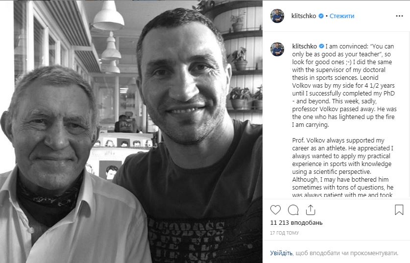 Бывший чемпион мира по боксу Владимир Кличко сообщил о смерти близкого для себя человека. Ушел из жизни его научный руководитель Леонид Волков. Об этом Кличко сообщил в Instagram.