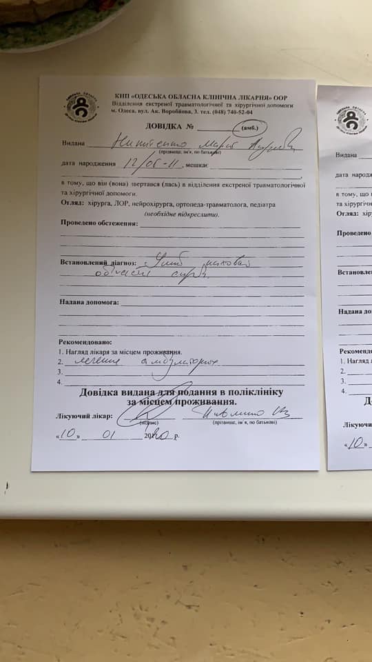 Медики диагностировали у Марата ушиб паховой области, о чем свидетельствует выложенная Гинкиновой справка. Из документ видно, что ребенку назначили амбулаторное лечение.