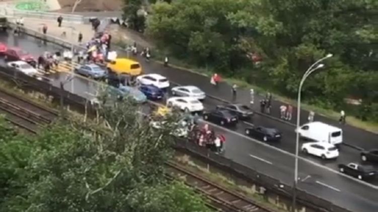 "Мост Метро. Люди перекрыли дорогу. Движение затруднено. Пробка от метро "Черниговская". Заранее планируйте свой маршрут", - говорится в сообщении.