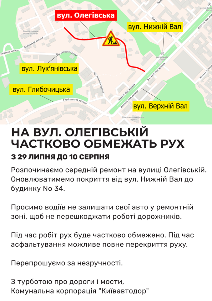 Также до 10 августа будет частично перекрыто движение на улице Олеговской в связи с ремонтом.