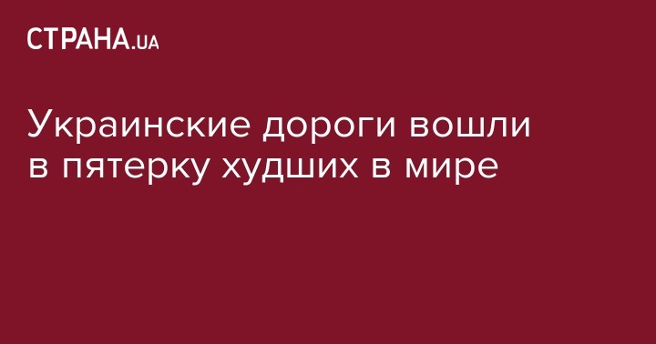 Украинские дороги заняли 134-е место в мировом рейтинге качества дорог, куда вошли 138 стран. Хуже только на Мадагаскаре, в Парагвае, Конго и Мавритании. Об этом говорится на сайте международной организации "Всемирный экономический форум", которая и составила рейтинг.