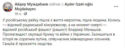 "В российском рейхе ушел из жизни гнусный, подлый человек. Когда-то - известный советский кинорежиссер, а на момент смерти - известный российский фашист (рашист) Владимир Меньшов. Пропагандист оккупации Крыма и войны с Украиной. Останется в истории как соратник Путина, соучастник международных преступлений. Позор и проклятие человечества", - написал он у себя в Facebook.