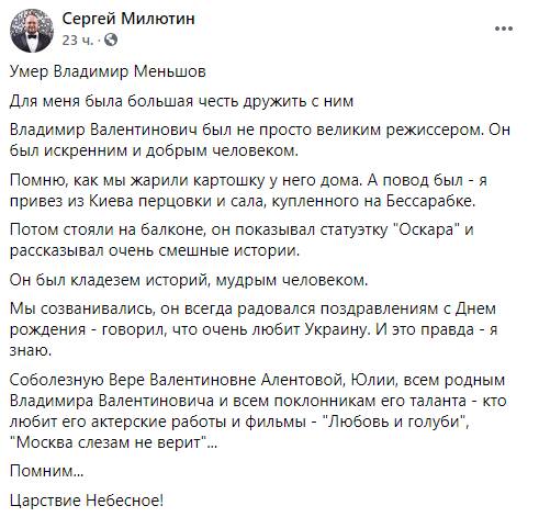 Царствие Небесное!", - написал Сергей Милютин.