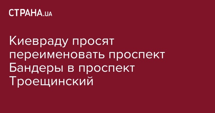 Жители Киева выступили с предложением переименовать проспект Бандеры в Киеве, который ранее назвался Московский проспект и сменил название в процессе декоммунизации. В петиции, зарегистрированной на сайте Киеврады, автор предлагает новое название - Троещинский проспект.