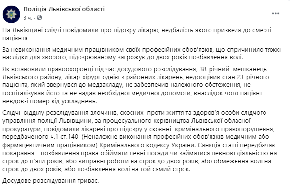Во время досудебного расследования правоохранители выяснили, что 38-летний врач одной из районных больниц, житель Львовского района недооценил состояние парня, который обратился в медучреждение. Правоохранители добавили, что хирург не провел надлежащее обследование пациента, не госпитализировал его в больницу его и не предоставил необходимую медпомощь. В результате, пациент вскоре умер от осложнений.