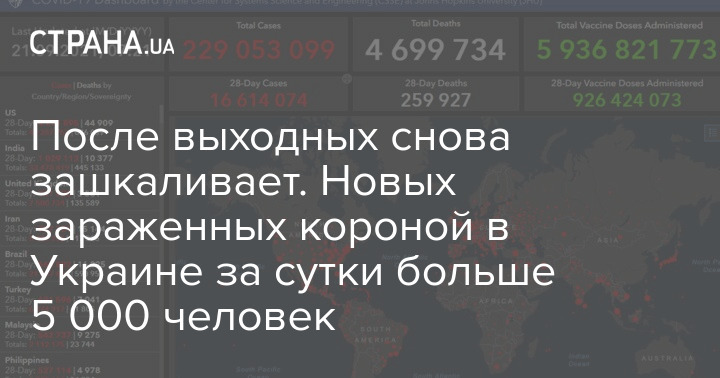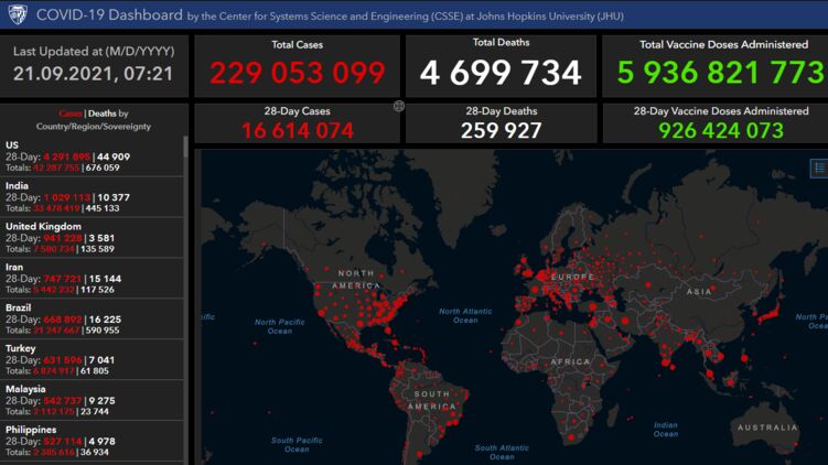 В целом на планете, по данным университета Джона Хопкинса на утро 21 сентября, число зараженных достигло отметки в 229 053 099 человек.