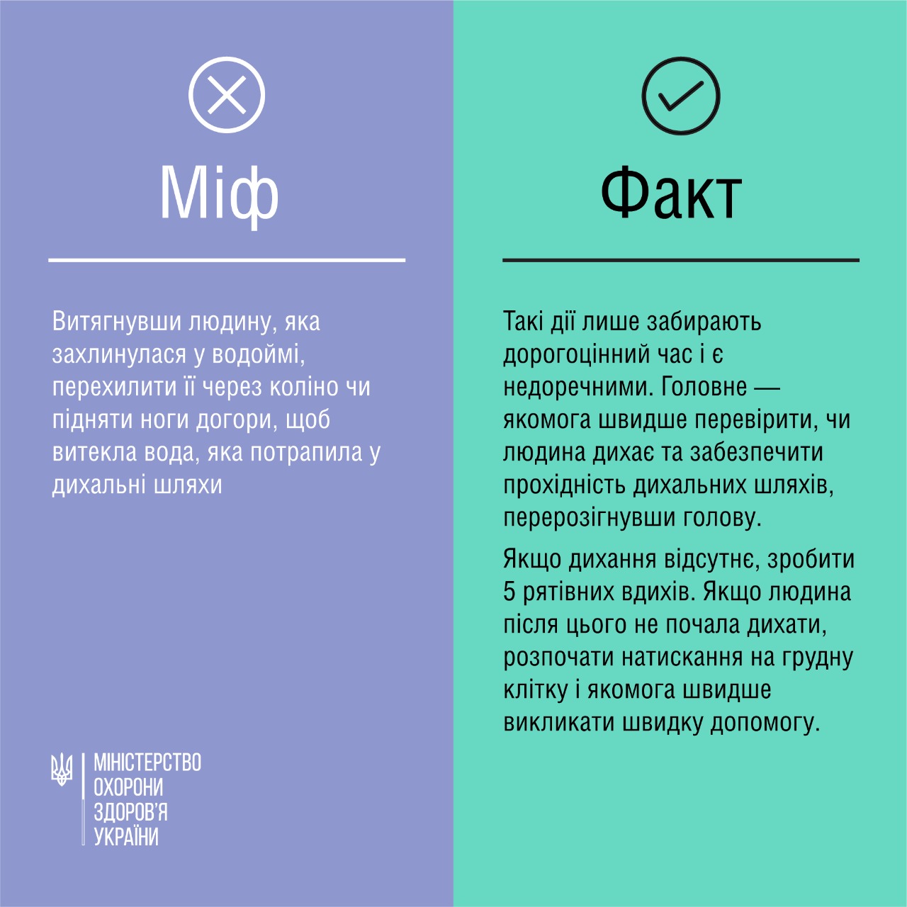 Министерство здравоохранения Украины продолжает развенчивать мифы о домедицинской помощи и публикует инфографику с основными ошибками, которые люди допускают при оказании помощи человеку, который потерял сознание, захлебнулся в воде или пострадал от удара молнии.
