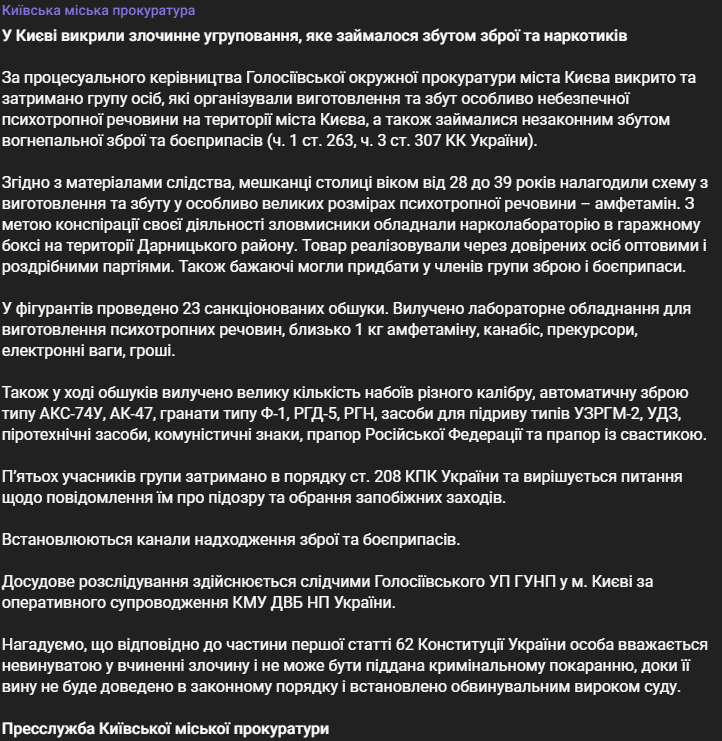 В Киеве при процессуальном руководстве Голосеевской окружной прокуратуры разоблачили и задержали группу лиц, организовавших изготовление и сбыт особо опасного психотропного вещества на территории столицы, а также занимавшихся незаконным сбытом огнестрельного оружия и боеприпасов.