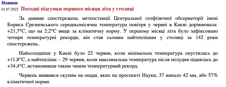 Июнь-2022 в Киеве вошел в топ-7 самых самых жарких в истории наблюдений. Норма превышена на 2,2 градуса