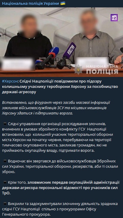 В июне подозреваемый, находясь в оккупированном Херсоне, через СМИ призвал военнослужащих ВСУ и местных жителей Херсона сдаться и поддержать врага и передавал оккупационным властям данные об участниках ТрО, заявили в Нацполиции.