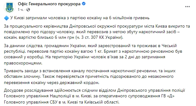 Речь идет о гражданине Украины, который зарегистрирован и проживает в Чехии. По данным Офиса генпрокурора, он перевозил партию кокаина. Брикет с наркотическим веществом весом в один кг был спрятан в коробку.
