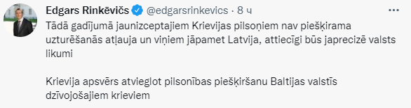 "Новоиспечённым гражданам России не будет выдаваться разрешение на пребывание, им нужно будет покинуть Латвию", - написал политик.