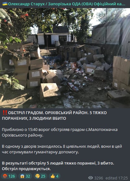 В селе под Запорожьем под обстрел россиян попали получавшие гуманитарку мирные жители. Есть погибшие