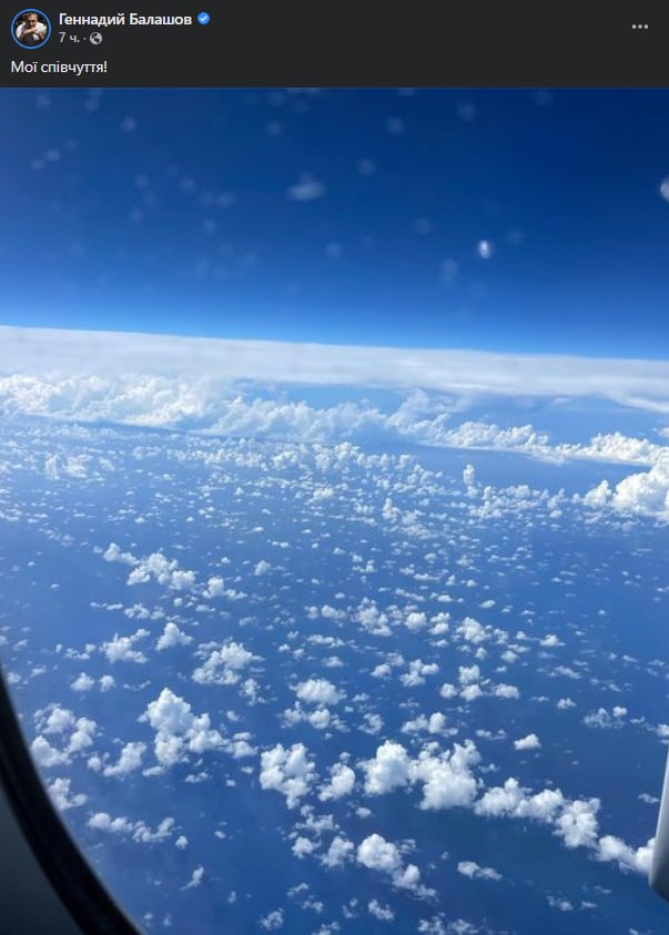 В четверг, 8 сентября, бизнесмен и основатель партии "5:10" Геннадий Балашов сообщил, что покинул Украину. Он опубликовал фото с видом из иллюминатора самолета, подписав его: "Мои соболезнования".