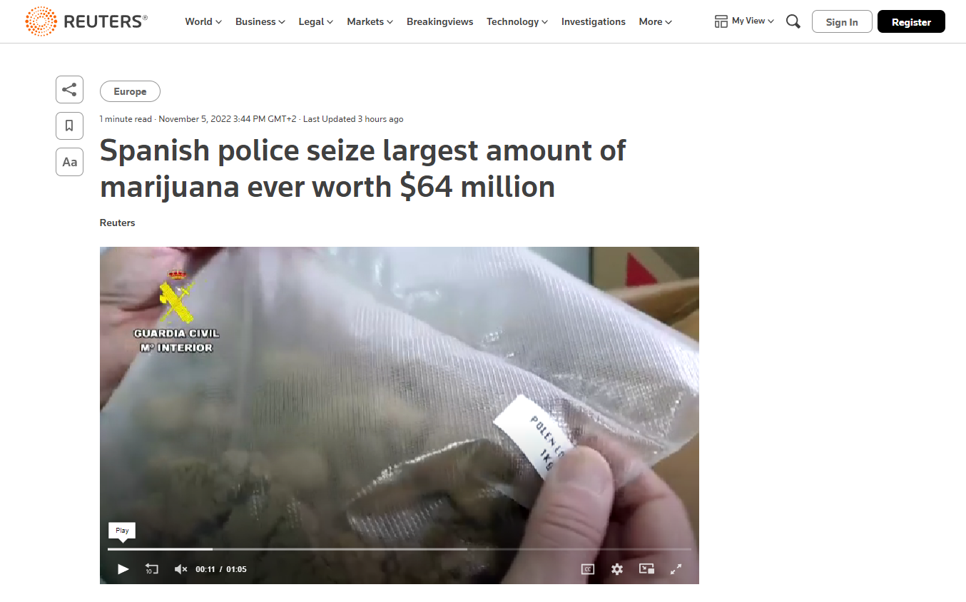 Испанская полиция изъяла самую большую партию марихуаны в мировой истории. Стоимость расфасованного наркотика составляет 64 миллиона евро.