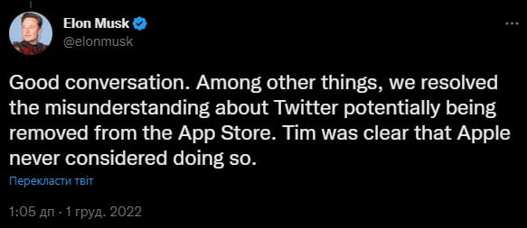"Среди прочего, мы устранили недопонимание относительно угрозы удаления Twitter из App Store. Тим ясно дал понять, что Apple никогда об этом не думала", - сообщил Маск.
