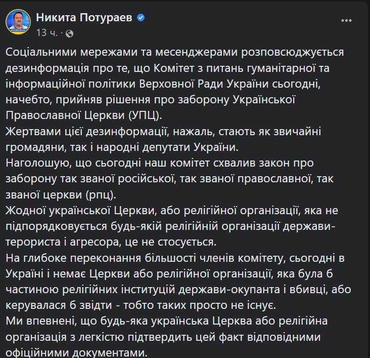 Глава парламентского комитета по вопросам гуманитарной и информполитики "слуга народа" Никита Потураев опровергает, что одобренный вчера комитетом законопроект о запрете структур РПЦ в Украине означает запрет Украинской православной церкви (как это было истолковано многими комментаторами и некоторыми нардепами).