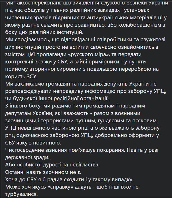 - "Мы призываем граждан и народных депутатов Украины не распространять ложную информацию о запрете УПЦ или любой другой религиозной организации".