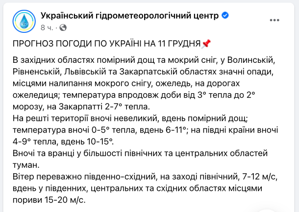В Волынской, Ровенской, Львовской и Закарпатской областях сильные осадки, местами налипание мокрого снега, гололедица, на дорогах гололедица; температура в течение суток от 3° тепла до 2° мороза, на Закарпатье 2-7° тепла.