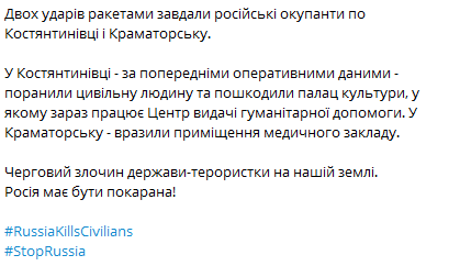 Глава Донецкой ОВА Павел Кириленко подтверждает ракетные удары по Константиновке и пишет о прилетах в Краматорске, где противник поразил помещение медицинского учреждения.