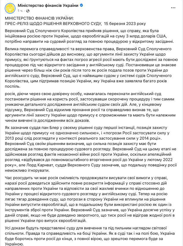 Россия подала иск в Высокий суд Лондона. В 2017 году суд признал, что Украина обязана выплатить РФ все 3 млрд - плюс накопленный процент. Украина снова не заплатила и подала на апелляцию в 2018 году.