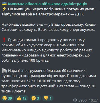 В Киевской области из-за резкого ухудшения погоды начались отключения света