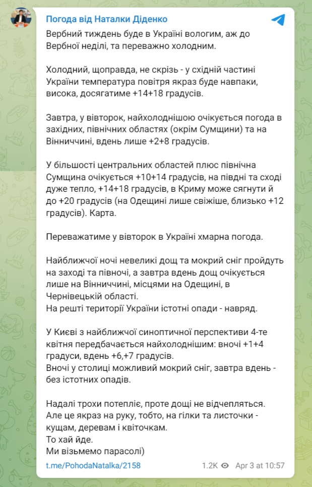 Дожди, мокрый снег и умеренное тепло. Синоптик рассказала, какая погода ждет украинцев на Вербную неделю