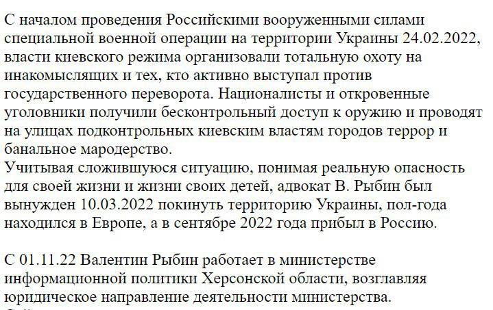 Так указано, что Рыбин покинул территорию Украины 10 марта 2022 года, полгода находился в Европе, а в сентябре 2022 года прибыл в Россию, где сейчас работает в "министерстве информационной политики Херсонской области", возглавляя юридическое направление деятельности "министерства" (см скрин).