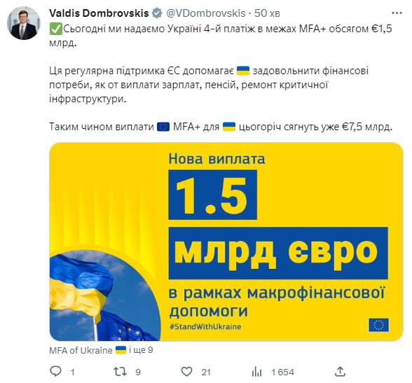 Всего выплаты MFA для Украины в этом году достигнут 7,5 миллиардов евро.