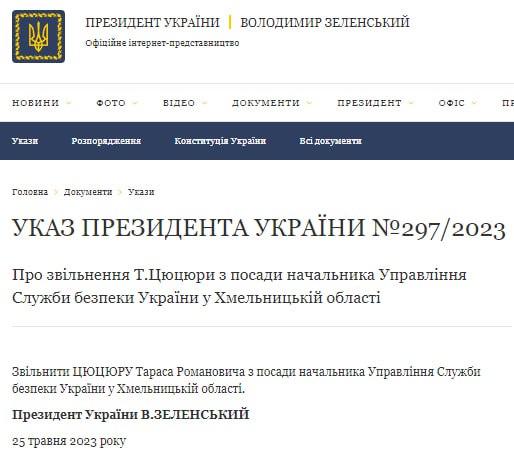 Президент Украины Владимир Зеленский уволил Тараса Цюцюру с должности начальника Управления Службы безопасности Украины в Хмельницкой области.