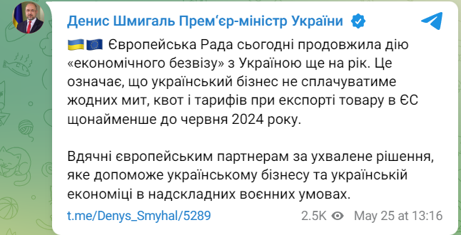 Премьер-министр выразил признательность европейским партнерам за данное решение, отметив, что оно окажет "существенную поддержку украинскому бизнесу и экономике страны в условиях сложной военной обстановки".