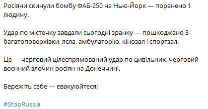 На Нью-Йорк Донецкой области противник сбросил авиабомбу ФАБ-250. Ранен один человек.