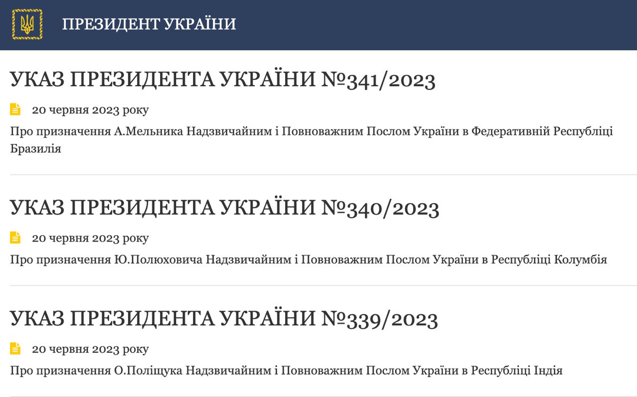 Президент Владимир Зеленский назначил трех новых послов Украины - в Бразилии, Индии и Колумбии.