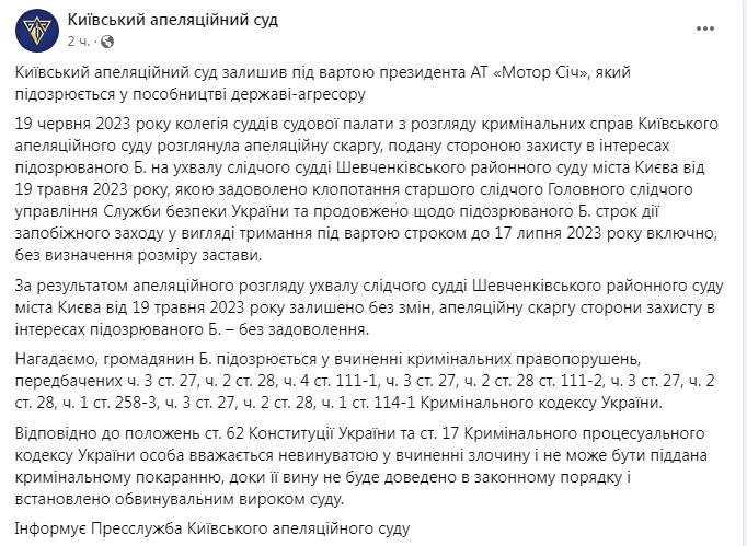 "19 июня 2023 года коллегия судей судебной палаты по рассмотрению уголовных дел Киевского апелляционного суда рассмотрела апелляционную жалобу, поданную стороной защиты в интересах подозреваемого Б. на определение следственного судьи Шевченковского районного суда города Киева от 19 мая 2023 года, которым удовлетворено ходатайство старшего следователя Главного следственного управления Службы безопасности Украины и продлен в отношении подозреваемого Б. срок действия меры пресечения в виде содержания под стражей сроком до 17 июля 2023 включительно, без определения размера залога", - сказано в посте.